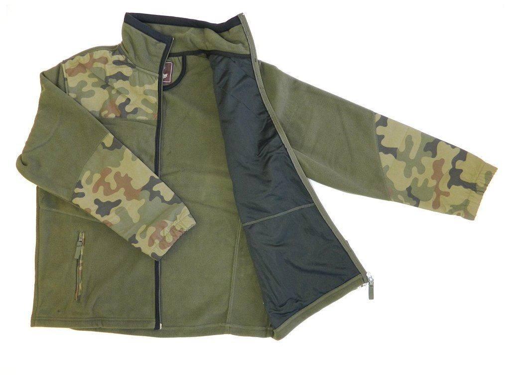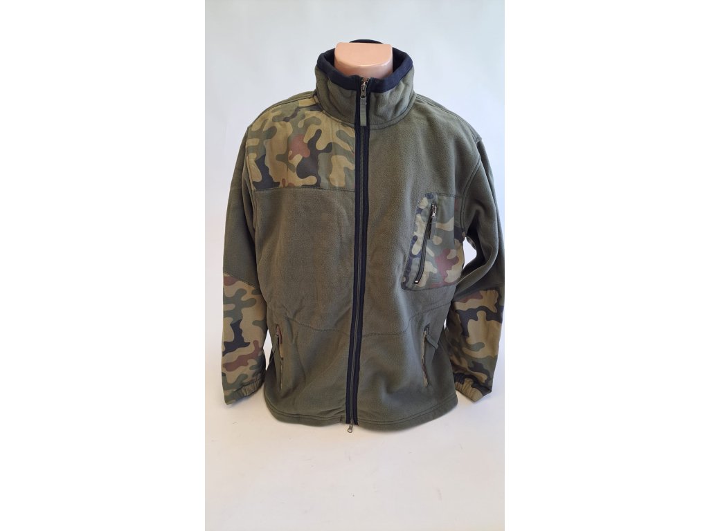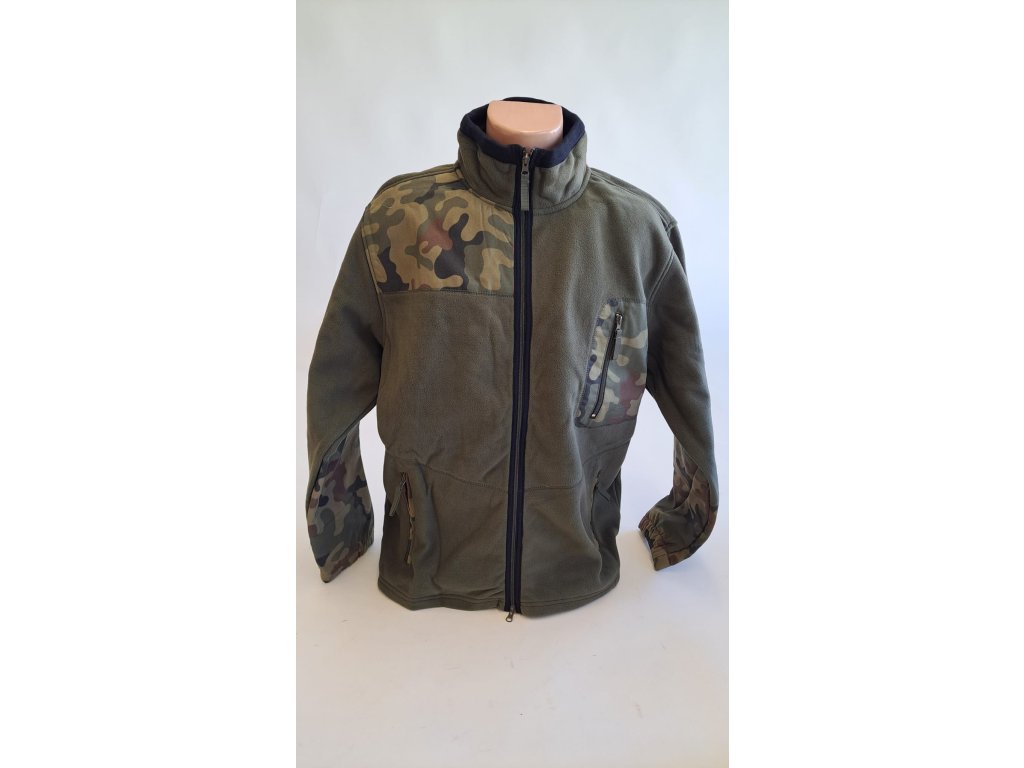 Bunda , mikina fleece zelená s maskovacími aplikacemi.