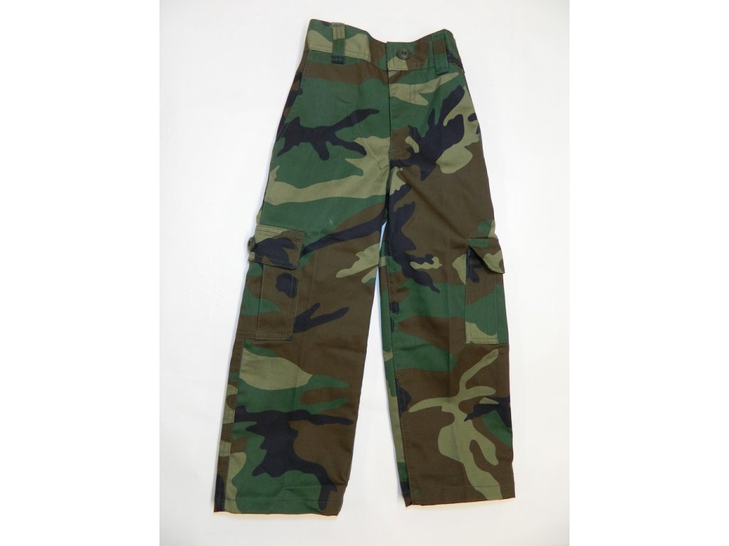 Kalhoty US BDU v dětské ve vzoru WOODLAND vhodné na tábory, kempování, na ryby....